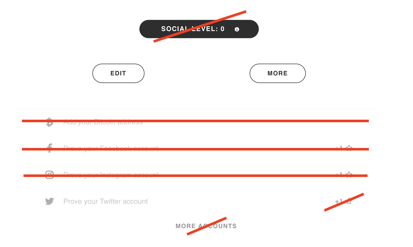 Note how the "+1" and star icon are also removed from Twitter's listing despite otherwise retaining it. That's because these indicators don't make sense anymore when it's the only verification option left and there's no "social level" accumulation anymore.