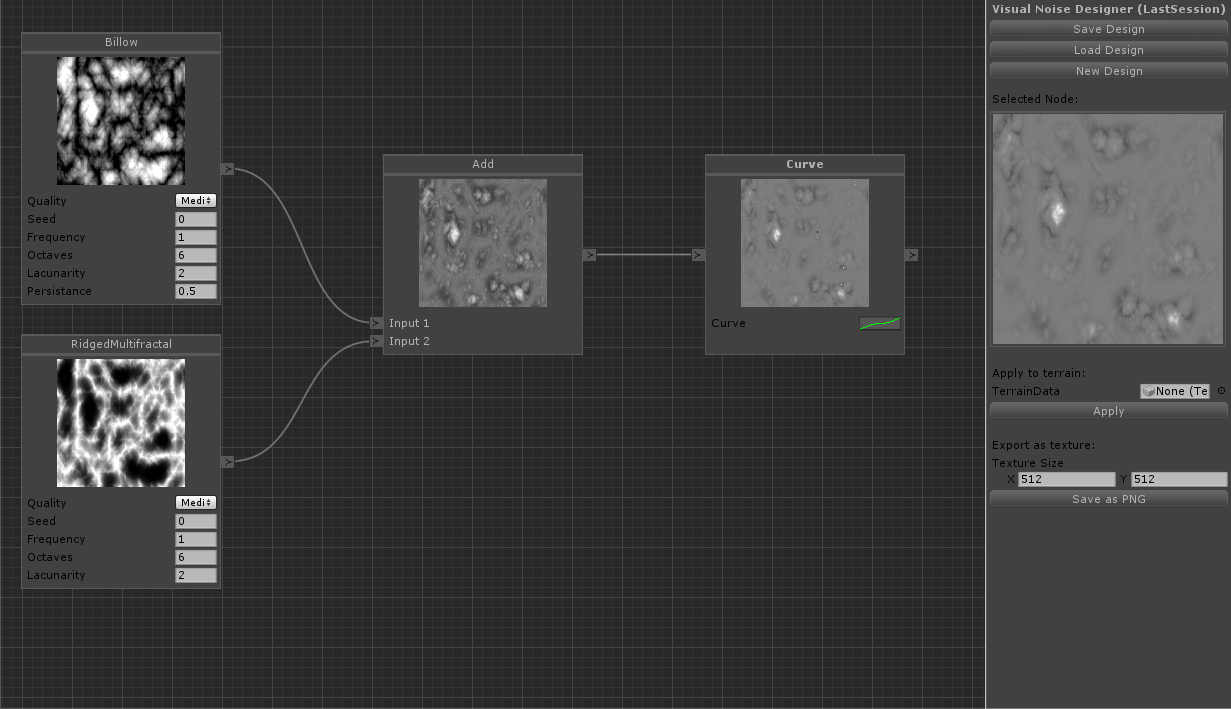 - Resulting texture can be applied directly to TerrainData as heightmap or saved as PNG